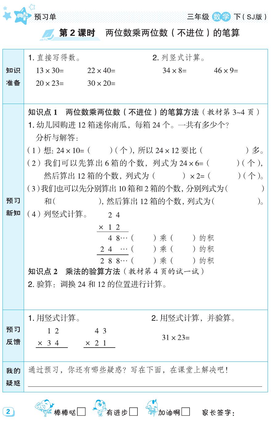 苏教版三年级数学下册典中点预习单