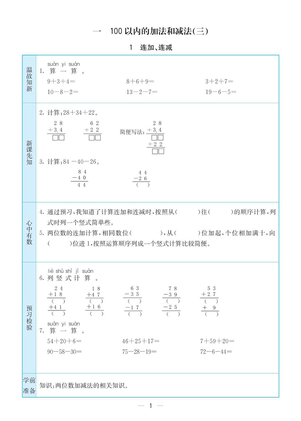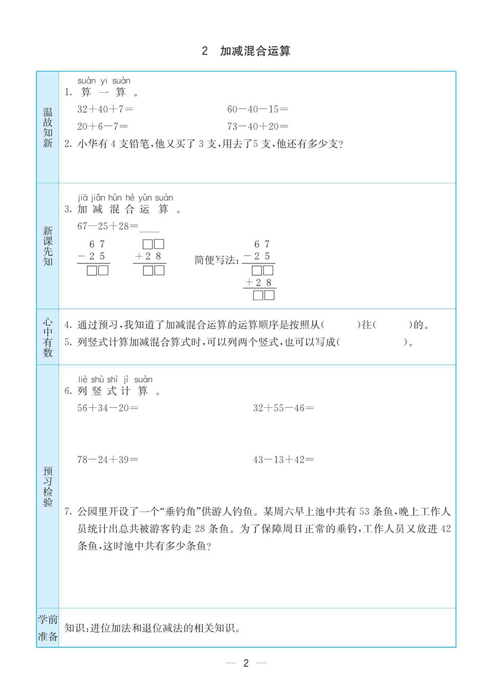 苏教版二年级上册数学预习卡(可打印)下载: