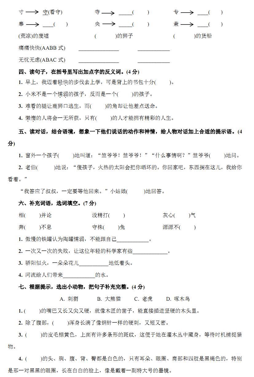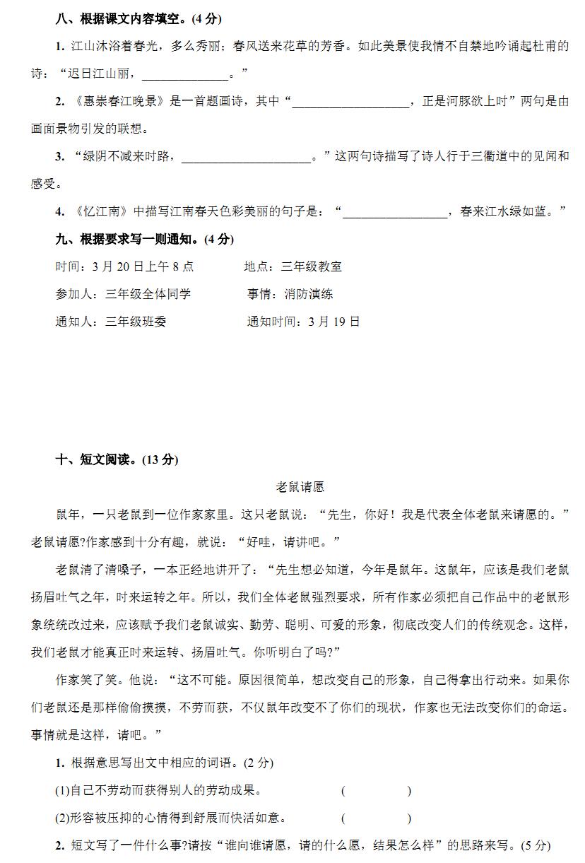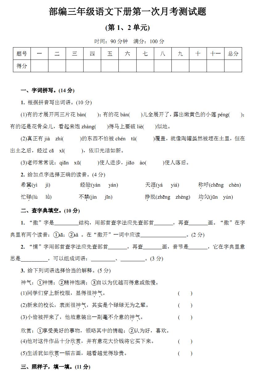 2021-2022学年部编版三年级下册语文第一次月考试卷(附答案)下载: