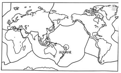 2022年1月15日,汤加附近海底火山发生剧烈喷发,下图为六大板块分布示意图。据此完成下面小题。