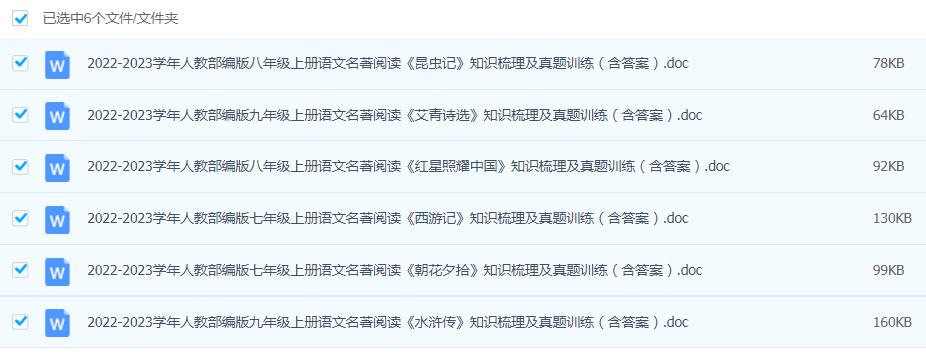 2022-2023学年人教部编版初中语文上册名著阅读知识梳理及真题训练(共6份 含真题训练答案)