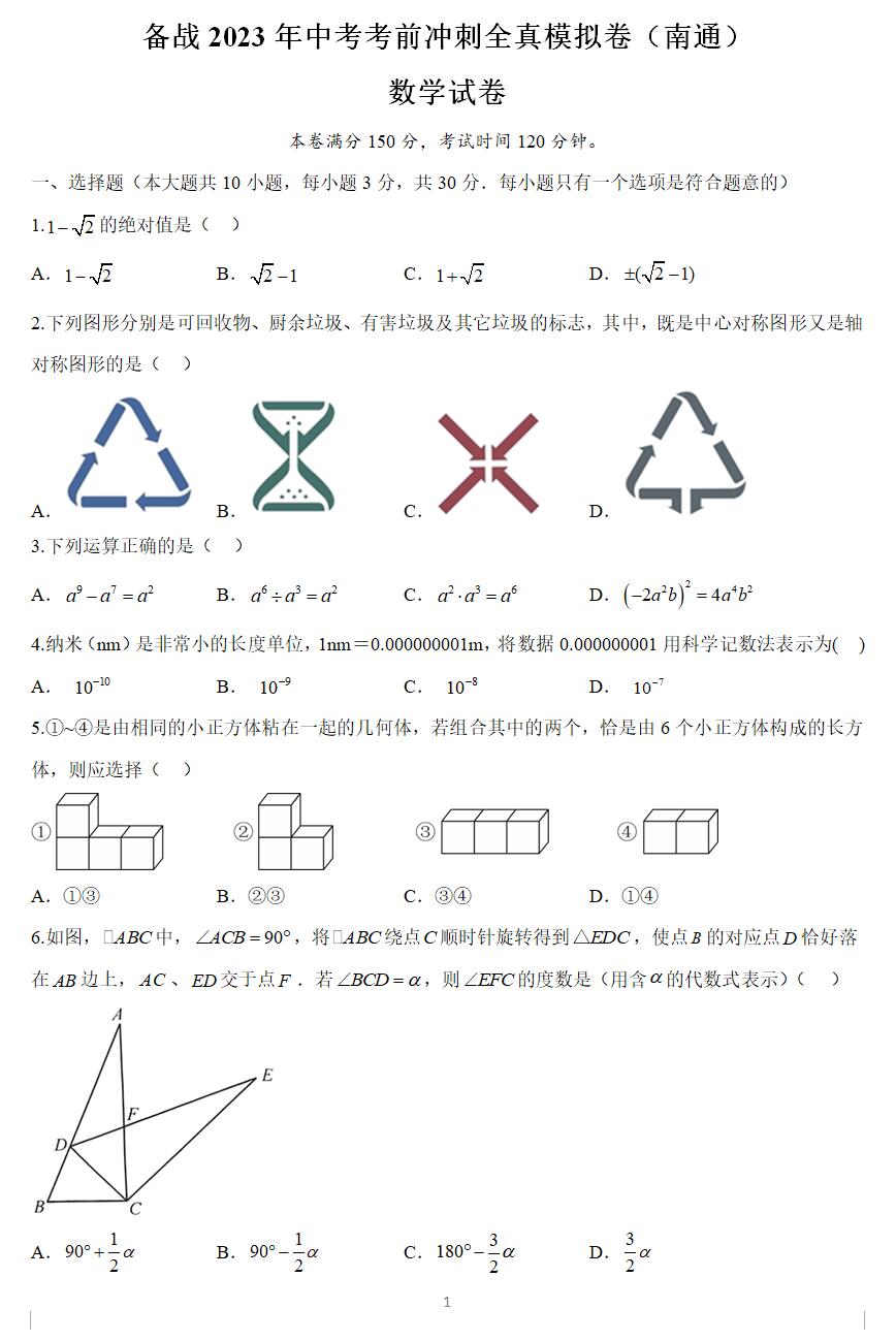 本资料来自专辑:备战2023年江苏各市中考数学考前冲刺全真模拟试卷汇总