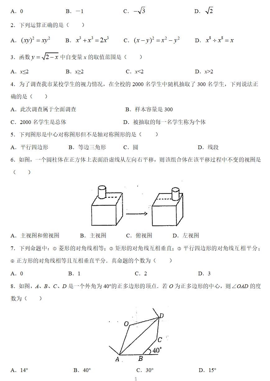 一、选择题(本大题共10小题,每小题3分,共30分。在每小题所给出的四个选项中,只有一项是正确的,请用2B铅笔把答题卡上相应的选项标号涂黑)