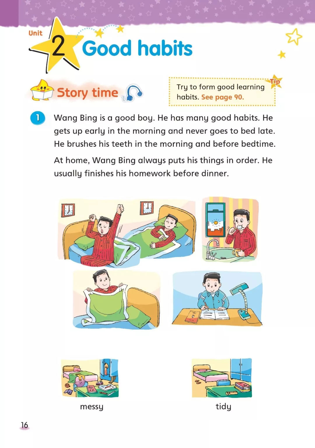 At home, Wang Bing always puts his things in order. He usually finishes his homework before dinner.