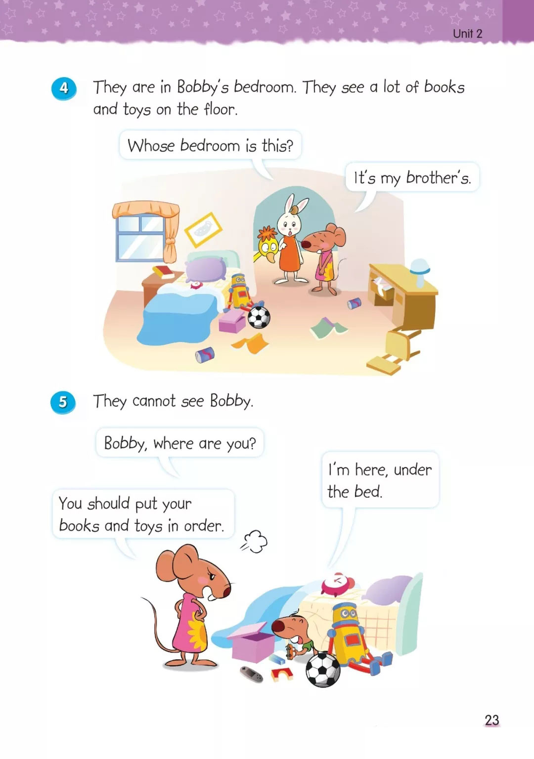 他们在博比的卧室里。他们在地板上看见许多书和玩具。