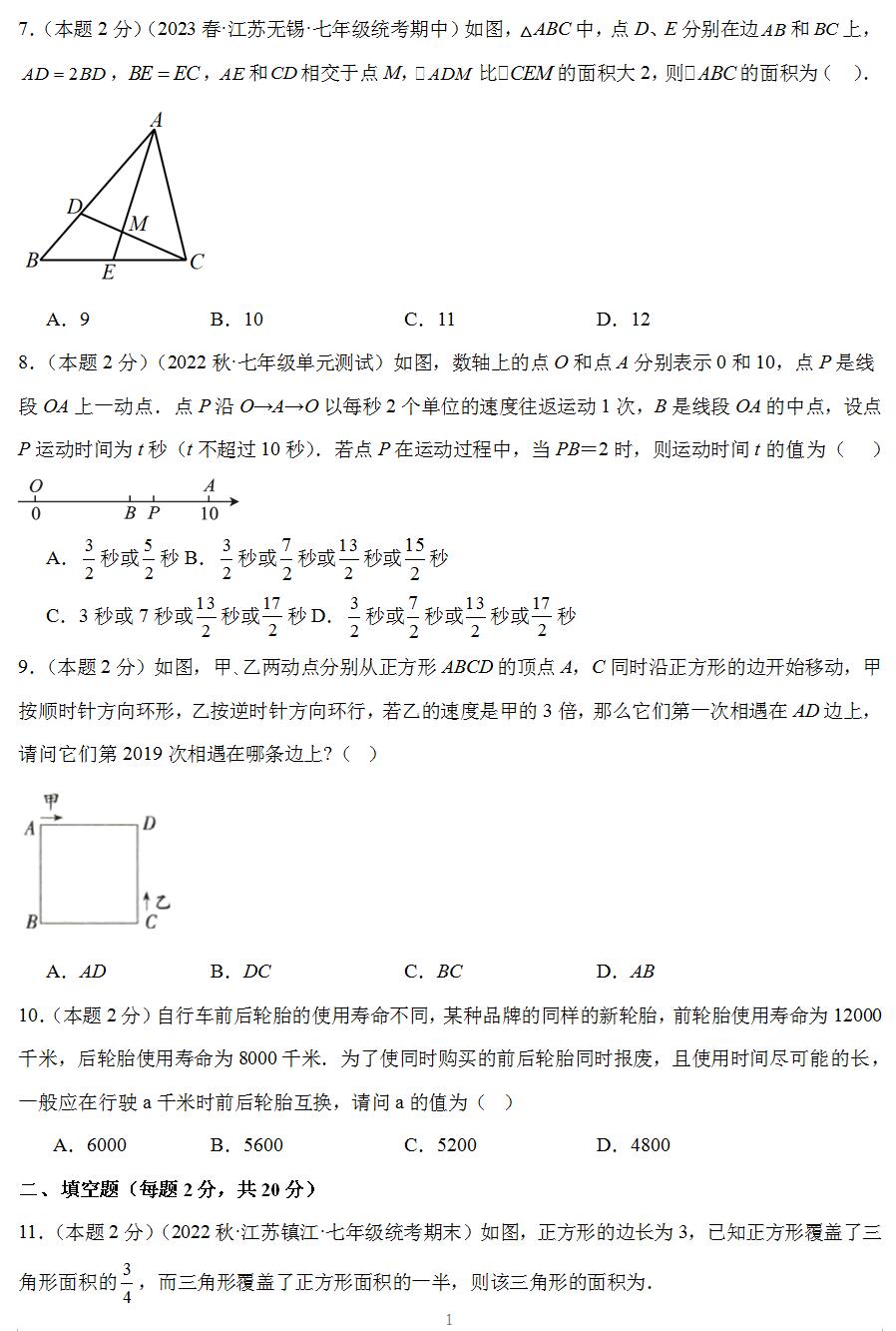 2.(本题2分)(2022秋·江苏苏州·七年级苏州市第一初级中学校校考期末)如图,将一张正方形纸片剪成四个小正方形,得到4个小正方形,称为第一次操作;然后,将其中的一个正方形再剪成四个小正方形,共得到7个小正方形,称为第二次操作;再将其中的一个正方形再剪成四个小正方形,共得到10个小正方形,称为第三次操作;…,根据以上操作,若要得到2023个小正方形,则需要操作的次数是( )