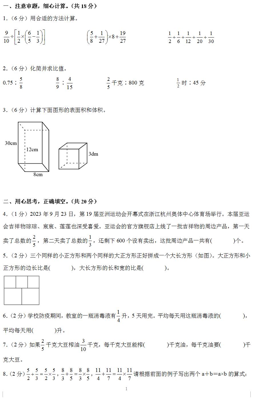 20.(1分)用同样长的铁丝围成两个长方形,甲长方形的长与宽之比为6∶1,乙长方形的长与宽之比为2∶1,那么,甲长方形的面积大于乙长方形的面积。( )