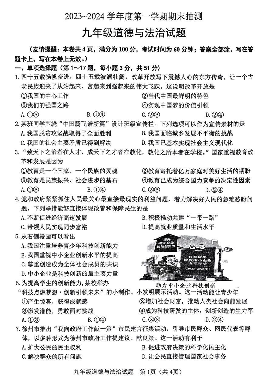 徐州市2023-2024学年九年级上学期期末抽测道德与法治试卷