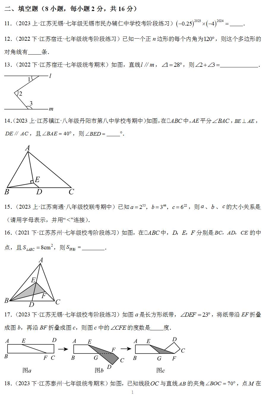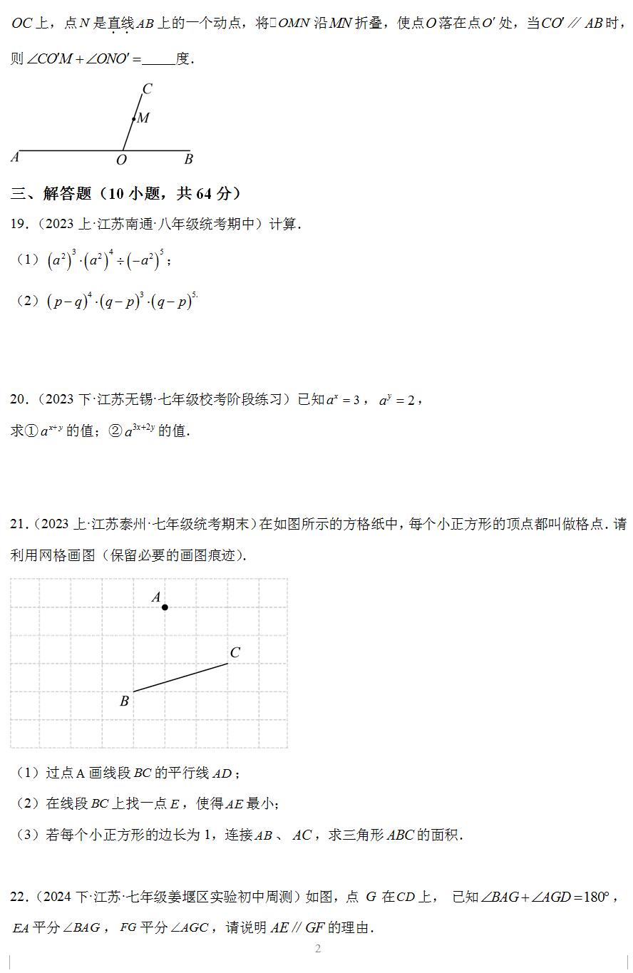 4.考试范围:苏科版七年级数学下册第7-8章。