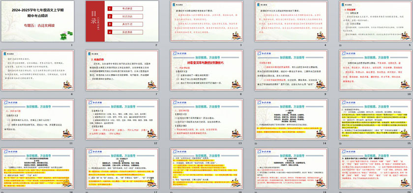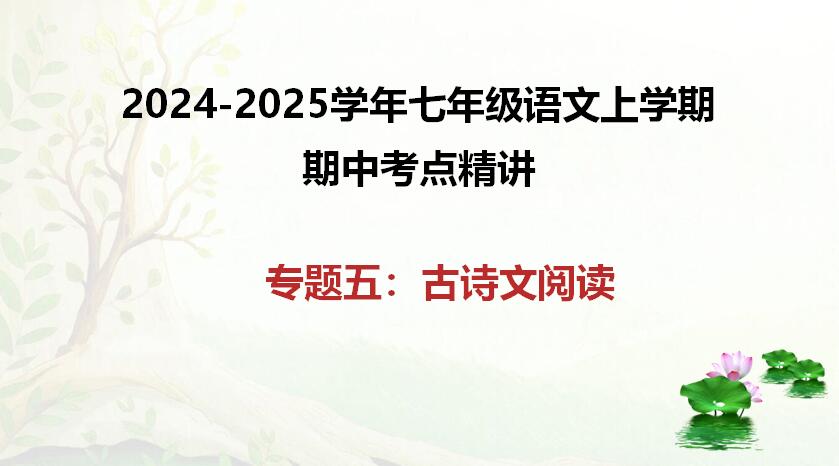本资料来自专辑: 2024-2025学年七年级语文上学期期中考点精讲PPT课件(统编版2024) 2024-2025学年七年级语文上学期期中考点精讲PPT课件(统编版2024): 专题01字词句积累-2024-2025学年七年级语文上学期期中考点精讲P... 查看文章 专题05古诗文阅读知识梳理与答题技巧-2024-2025学年七年级语文上学期期中考点精讲PPT课件(统编版2024) 资源下载此资源下载价格为2学币,VIP免费,请先登录资源每日更新! 升级终身VIP会员,享全站终身永久免费下载特权!限时优惠!如有问题,请联系客服QQ:6056064