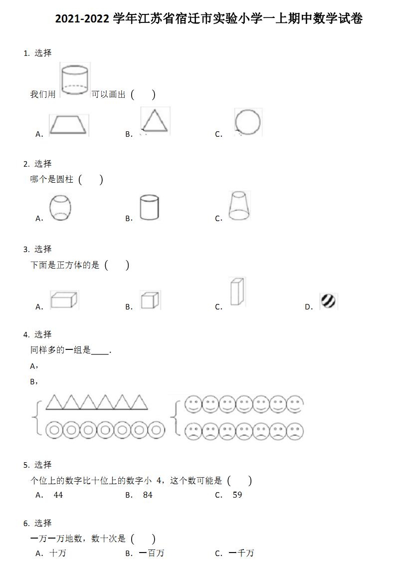 宿迁市实验小学2021-2022学年一年级上册数学期中试卷(含答案)下载: