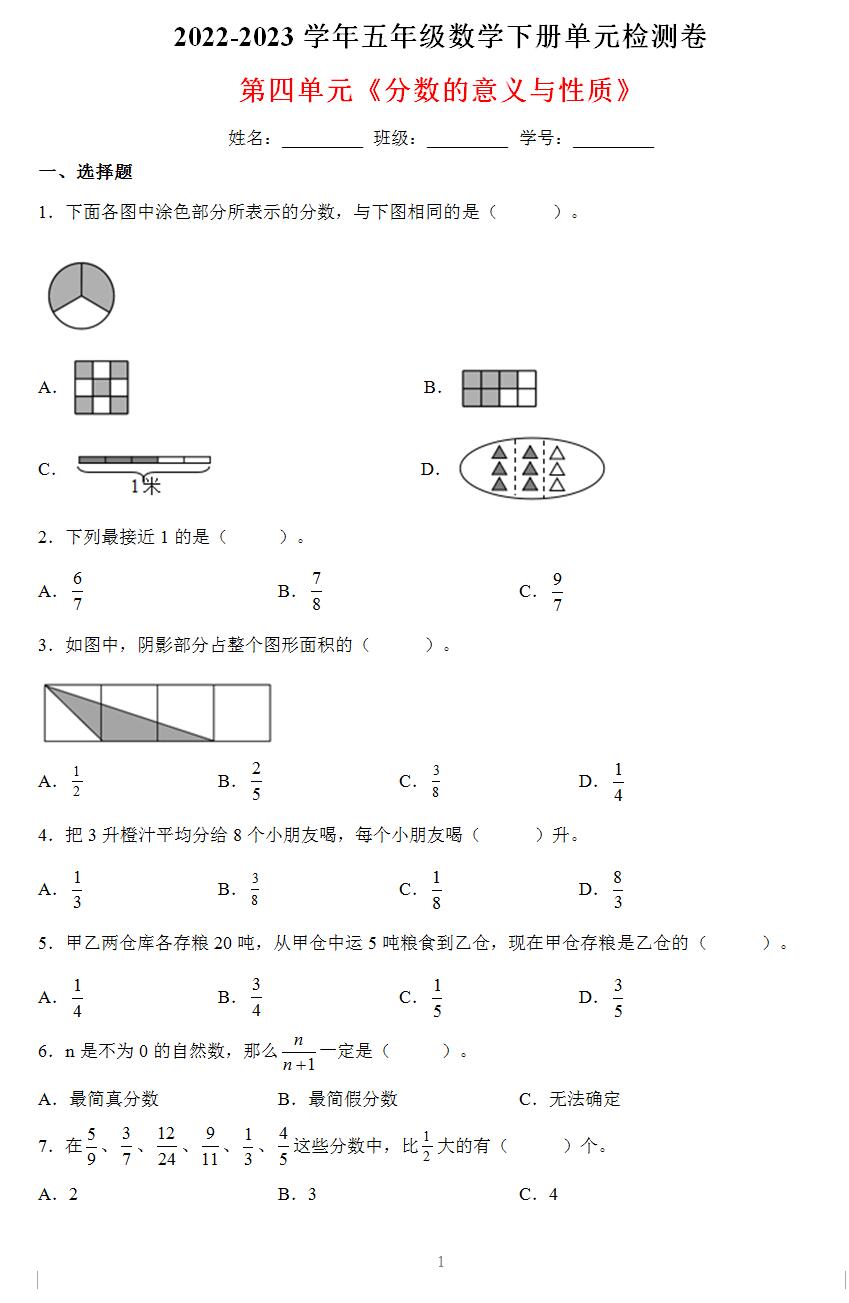 2022-2023学年苏教版五年级下册数学第四单元《分数的意义与性质》检测卷(含答案解析) 2022-2023学年苏教版五年级下册数学第四单元《分数的意义与性质》检测卷(含答案解析) 2022-2023学年苏教版五年级下册数学第四单元《分数的意义与性质》检测卷(含答案解析)