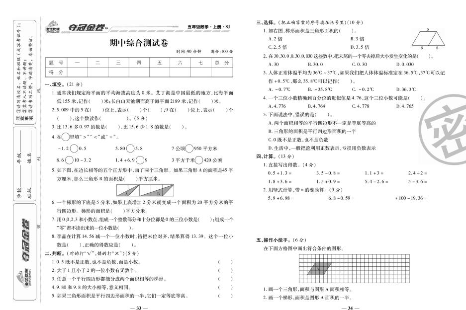 五年级上册数学《夺冠金卷》考点卷+单元卷+月考卷+期中卷+期末卷