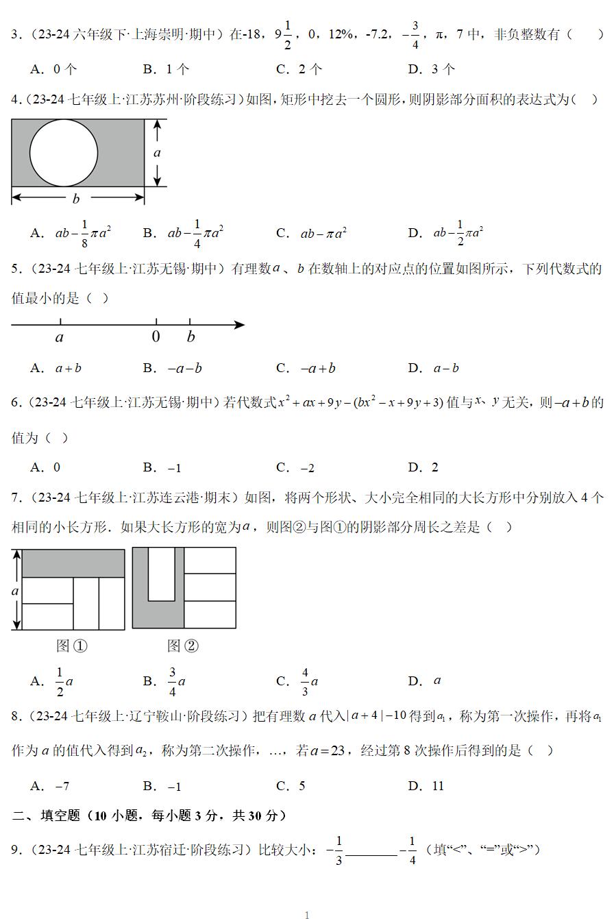 3.考试范围:七年级数学上册第1-3章(苏科版)