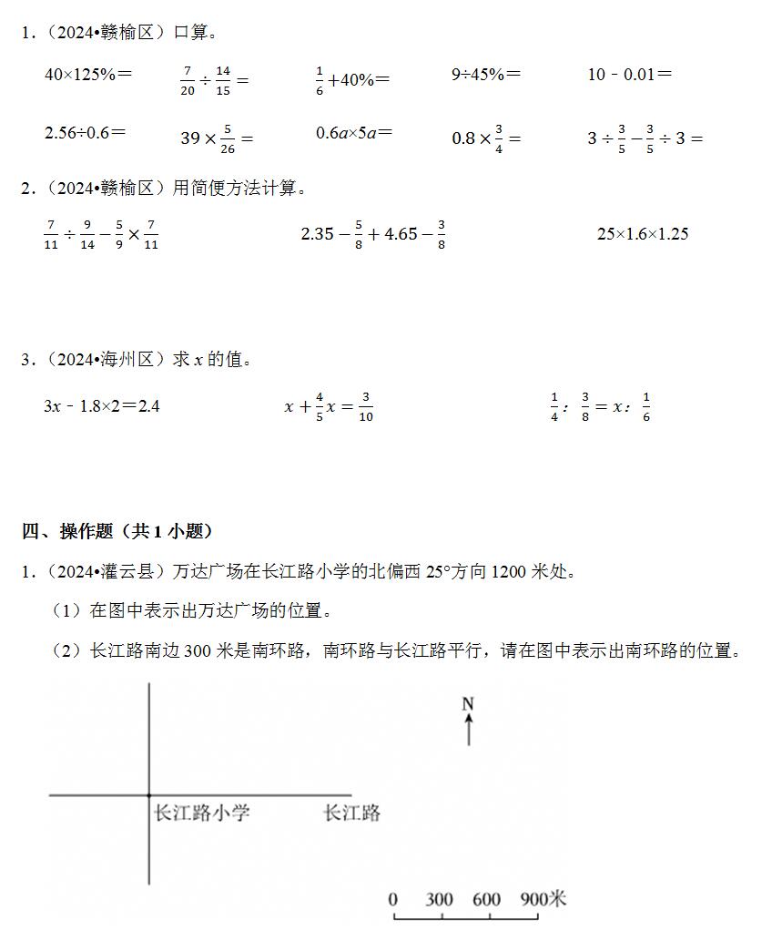 2.(2024•赣榆区)在一幅比例尺为1:3000000的地图上,量得A、B两地的距离为18厘米。甲、乙两车分别从A、B两地同时出发,相向而行,经过3小时两车相遇。已知甲车的速度是乙车的,则甲、乙两车的速度各是多少?